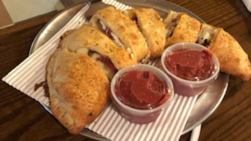 Despite an enticing variety of tempting appetizers (including garlic bread, onion rings, breaded ravioli, pepperoni sticks, and spicy-white cheddar bites, we were even more tempted by the main dishes—including, to my great delight—a New York-style calzone. What is this delicacy, you ask? A standard calzone is filled with both mozzarella and ricotta. That ricotta makes ALL the difference! Along with the calzone, we ordered the Florentine specialty pizza along with a chicken Caesar salad. Leland, our nine-year-old, quickly settled on a custom 8” pizza with sliced meatballs while Mae chose an 8” bacon and pineapple pizza. Our eight-year-old, Josephine, enthusiastically ordered the spaghetti and meatballs.