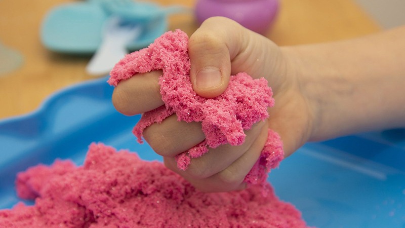 Moon sand is moldable like clay, but crumbles apart like sand, so kids can use it again and again. In a large container, mix together 3 cups cornstarch and 6 cups play sand. If you want, mix in an envelope of unsweetened Kool-Aid for color. Add water in increments (about 1½ cups total), mixing until you reach the desired consistency. Store your moon sand in an airtight container.
