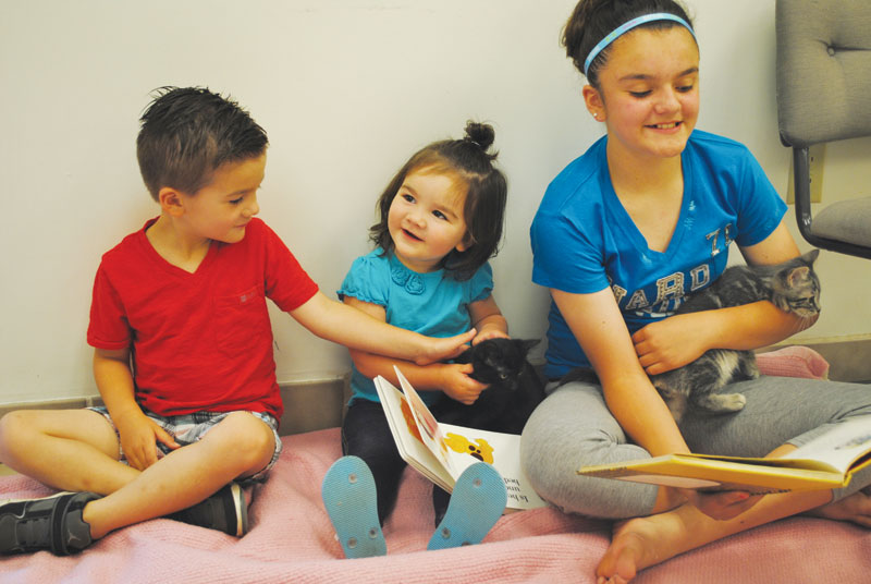 Natalie Duran, Kennel Supervisor at the Hancock County Humane Society, had a vision last year that resulted in a successful summer reading program for children and felines alike. This summer the Happy Tails program continues for children in Kindergarten through 8th grade accompanied by an adult who come and read to shelter cats. “The goal is to keep children reading during the summer while also giving our cats socialization and more exposure to people,” Natalie explains. “Last summer it worked really well. Families who participated still come in to see the cats they read to.” Beginning June 3rd and running through August 1st, participants can contact the Humane Society to sign up for a reading time slot with a furry friend. All reading time slots are 30 minutes long and occur on Wednesdays, Fridays and Saturdays.