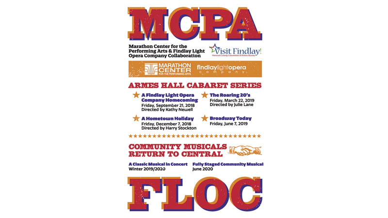 Funded in part by a grant from the Hancock County Convention & Visitors Bureau, the collaboration will begin this fall with four cabaret shows in the Roy & Marcia Armes Hall as part of the MCPA’s LIVE@ARMES Series. Winter of 2019/2020 will feature a semi-stage concert version of a musical with an all-community cast. This project will support a revival of the Findlay Light Opera Company which has been largely inactive since 2007.