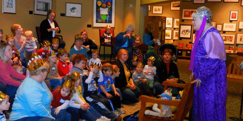 Kids love checking in with Ruby Sproul who dresses in theme to greet them with their name tag. Fun while engaged in stories encourages early literacy.