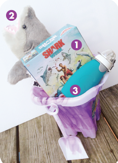 We’ve gathered up beach-themed items to gear up for the excitement of the Discovery Channel’s 29th Annual Shark Week (beginning June 26). Inside the sand bucket, which comes with a shovel, we have: